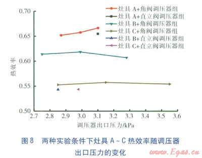 以直立閥鋼瓶作為氣源的實驗方法為:選取鋼瓶內(nèi)壓為0.03MPa,進行灶具熱效率實驗。待灶具燃燒穩(wěn)定后,將盛裝一定水的鋁鍋放于灶具上,待水溫升至高于初始溫度5℃時,開始攪拌,并計量燃氣耗量。待水溫比初始溫度高30℃時,關(guān)閉灶具。實驗數(shù)據(jù)經(jīng)過計算,可以得到灶具的熱效率[3]。以角閥鋼瓶作為氣源的實驗方法為:在LPG鋼瓶滿瓶條件下,分別將調(diào)壓器調(diào)至最大壓力(對應(yīng)調(diào)壓器最大刻度)、中間壓力、最小壓力(對應(yīng)調(diào)壓器最小刻度)進行實驗,實驗方法與以直立閥鋼瓶作為氣源的實驗方法相同。兩種實驗條件下灶具A~C熱效率隨調(diào)壓器出口壓力的變化見圖8。