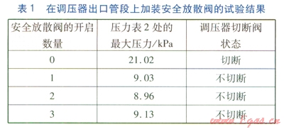 試驗方法:調(diào)壓器進口壓力設(shè)定為0.4MPa,出口壓力設(shè)定為7kPa,調(diào)壓器切斷閥的切斷壓力設(shè)定為9.8kPa,安全放散閥開啟壓力為8.4kPa。對不開啟安全放散閥、開啟l個安全放散閥、開啟2個安全放散閥及開啟3個安全放散閥這3種工況進行試驗,觀察壓力表2的讀數(shù),試驗結(jié)果見表1。