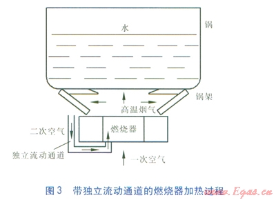 在燃?xì)饨M成一定的情況下,假設(shè)燃燒完全,煙氣體積取決于過??諝庀禂?shù)。要減小煙氣體積,可以降低過??諝庀禂?shù),改善二次空氣補(bǔ)充。對(duì)于嵌入式燃?xì)庠?,煙氣排放與二次空氣補(bǔ)充都處在鍋底與燃燒器之間的同一空間內(nèi),兩者流動(dòng)方向相反。在各自的流動(dòng)過程中,兩者必然相互干擾和作用,存在氣體成分交換和熱量交換。高溫?zé)煔庠谂欧胚^程中,煙氣的部分熱量被二次空氣帶走,導(dǎo)致煙氣溫度下降,降低了煙氣對(duì)鍋和水的加熱能力。同時(shí),部分煙氣混合在二次空氣內(nèi),導(dǎo)致二次空氣中氧含量降低,火焰外焰加長,也降低了高溫?zé)煔鈱?duì)鍋和水的加熱能力。因此二次空氣補(bǔ)充通道獨(dú)立設(shè)置將減少熱損失。