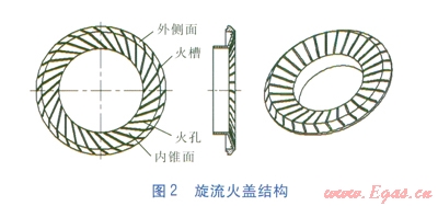 ①燃燒器火蓋設(shè)計(jì)成旋流結(jié)構(gòu)