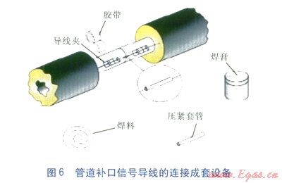 管道補口信號導(dǎo)線的連接成套設(shè)備(見圖6)包括電纜夾、膠帶、壓緊套管、焊料、焊膏等,除可滿足管道補口信號導(dǎo)線的連接要求外,還可滿足其他位置信號導(dǎo)線的連接,以及信號導(dǎo)線與出線電纜的連接。
