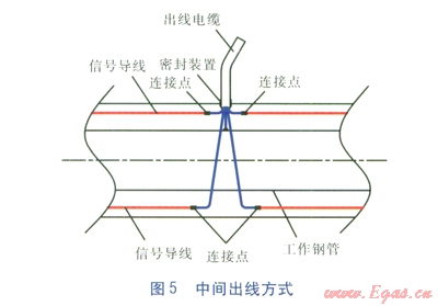 中間出線用于將整個管網(wǎng)分成若干一定長度的管段,以滿足監(jiān)測儀最大監(jiān)測管段長度的需要。出線電纜采用五芯導(dǎo)線,其中四根導(dǎo)線分別連接4根信號導(dǎo)線,第五根導(dǎo)線連接工作鋼管,出線電纜通過密封裝置引出,見圖5。