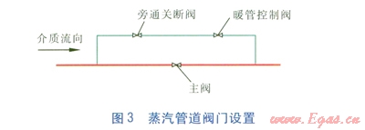 蒸汽管道的啟動需要有一個暖管過程。CJJ 34—2010第8.5.10條要求“蒸汽管道啟動暖管需控制流量時,管道閥門應(yīng)裝設(shè)口徑較小的旁通閥作為控制閥門”。這是由于主閥口徑較大時,若暖管過程使用主閥小開度暖管,高速蒸汽通過主閥小開度的縫隙,蒸汽分子或管道內(nèi)的其他微小雜質(zhì)顆粒沖刷密封面,使密封面遭到破壞。CJJ 34—2010要求蒸汽管道啟動暖管需控制流量時管道閥門應(yīng)裝設(shè)口徑較小的旁通閥作為控制閥門無疑是正確的,因為這樣做可以保護(hù)大口徑主閥。但是還應(yīng)該注意小口徑旁通閥的時徑和閥門類型的合理選擇,根據(jù)我們的實踐經(jīng)驗,小口徑旁通閥的口徑應(yīng)按主閥口徑的1/10選取,但最小不應(yīng)小于DN 50mm。而且小口徑旁通閥應(yīng)設(shè)置兩個(見圖3),一個作為暖管時的控制閥,另一個作為旁通管的關(guān)斷閥,這兩個小口徑閥門均應(yīng)選擇截止閥。這是因為蒸汽暖管時間較長,有時候控制閥暖管時的開度仍然較小,仍然有較大可能因高速蒸汽通過控制閥小開度的縫隙時將控制閥的密封面破壞,如果不再設(shè)置一個旁通關(guān)斷閥,一旦暖管控制閥的密封面被破壞,主閥的關(guān)閉將起不到關(guān)斷管路的作用。