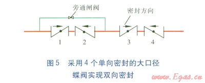 經(jīng)研究,如圖5所示采用4個單向密封的大口徑蝶閥,達(dá)到雙向密封的目的,而且采取保護(hù)措施,可以使大口徑蝶閥長期處于良好工作狀態(tài)。