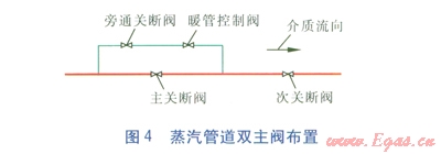 在可能的情況下,蒸汽管道暖管啟動后,盡可能待管道閥后蒸汽壓力達(dá)到閥前壓力時再開啟大口徑主閥,這樣可以保證大口徑閥門開啟過程中前后無壓差,大口徑閥門的密封面可得到有效的保護(hù)。如果蒸汽壓力較高(1.0MPa或以上)且無法做到利用旁通閥使閥后壓力達(dá)到或接近閥前壓力時開啟主閥,為保護(hù)大口徑主閥的密封面,可采取雙主閥的布置方法(見圖4)。