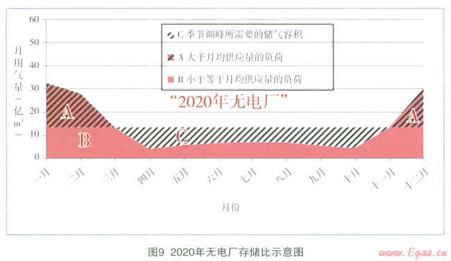預(yù)計(jì)到2020年,有電廠、無(wú)電廠存儲(chǔ)比分別為:25%、33%,2020有電廠的存儲(chǔ)比最小。既:2020年有電廠、2020年無(wú)電廠理論季節(jié)調(diào)峰量與年用氣量之比分別為25%、33%,2020年有電廠有情況下需最多存儲(chǔ)年用氣量的25%滿足調(diào)峰需求,存2020年無(wú)電廠的情況下需最多存儲(chǔ)年用氣量的33%才能滿足季調(diào)峰的需要。