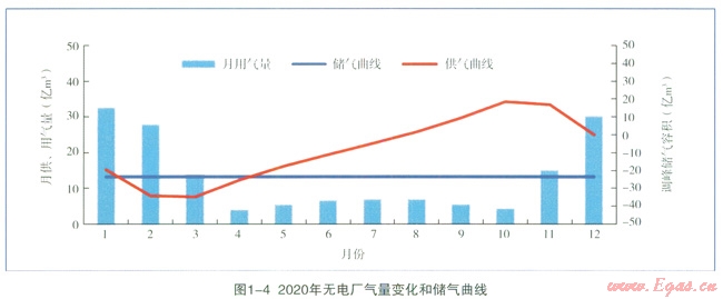 2020年有電廠、2020年無(wú)電廠兩種情況供氣曲線、用氣曲線、儲(chǔ)氣設(shè)施工作曲線合成圖分別如圖1-3、1-4所示,圖中供應(yīng)曲線、用氣曲線對(duì)應(yīng)左側(cè)縱坐標(biāo),儲(chǔ)氣曲線對(duì)應(yīng)右側(cè)縱坐標(biāo)。用氣曲線代表負(fù)荷的逐月變化情況,供氣曲線代表氣源在一年內(nèi)連續(xù)均勻供氣,儲(chǔ)氣曲線代表自計(jì)算開始時(shí)算起天然氣供應(yīng)量累計(jì)值與用氣量累計(jì)值之差。