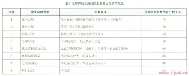 表4匯總了檢測過程中發(fā)現(xiàn)的常見問題以及占總檢測臺(tái)數(shù)的百分?jǐn)?shù)。其中常見的直接影響焊接質(zhì)量的問題主要是輸出電壓和環(huán)境溫度測量,而電阻值測量與焊口信息兩方面是電熔焊機(jī)普遍存在的問題。這應(yīng)引起焊機(jī)廠家與焊接質(zhì)量管理部門的重視。