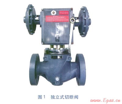 城鎮(zhèn)燃?xì)庾粤κ角袛嚅y根據(jù)組裝方式不同,主要分為兩大類:一種是作為獨(dú)立的切斷裝置,安裝于調(diào)壓器之前,稱為獨(dú)立式切斷閥,見(jiàn)圖1;另外一種是集成于調(diào)壓器上,作為調(diào)壓器的輔助構(gòu)件之一,稱為嵌入式切斷閥,見(jiàn)圖2。