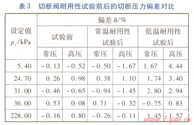 切斷閥在使用過(guò)程中,實(shí)際的切斷壓力值與切斷壓力設(shè)定值相比會(huì)有一定的偏差,常溫耐用性試驗(yàn)后的偏差會(huì)稍高于耐用性試驗(yàn)前的偏差,低溫耐用性試驗(yàn)后的偏差更大,可見(jiàn)低溫條件下的頻繁切斷會(huì)導(dǎo)致切斷閥的實(shí)際切斷壓力漂移得更為嚴(yán)重。