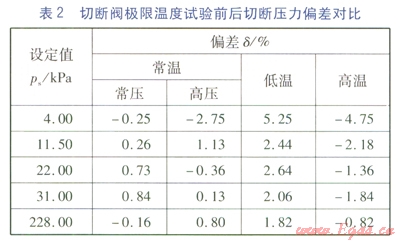 極限溫度條件會(huì)導(dǎo)致切斷閥的實(shí)際切斷壓力值與切斷壓力設(shè)定值之間產(chǎn)生一定的偏差,且比常溫條件下的偏差更大。因此廠家在進(jìn)行產(chǎn)品研發(fā)時(shí),要充分考慮極限溫度條件對(duì)切斷閥切斷性能的影響。