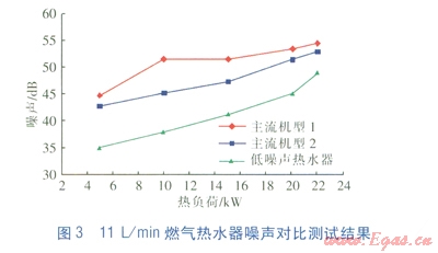 由圖3可知,當(dāng)熱負(fù)荷在18kW以下時(shí),11L/min的低噪聲熱水器的噪聲比主流機(jī)型低7dB以上;最大熱負(fù)荷時(shí),低4dB以上。