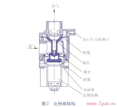 比例閥還具有穩(wěn)定燃?xì)鈮毫ψ饔茫?dāng)作用在壓力調(diào)節(jié)器膜片上的燃?xì)鈮毫υ龃髸r,膜片帶動閥芯向下運(yùn)動減小相對開度,保證出口壓力的穩(wěn)定;反之,當(dāng)作用在壓力調(diào)節(jié)器膜片上的燃?xì)鈮毫p小時,膜片帶動閥芯向上運(yùn)動增大相對開度,保證出口壓力的穩(wěn)定。