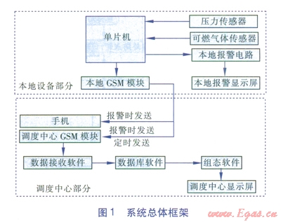 該系統(tǒng)主要由l2部分組成,包括手機(jī)、本地GSM模塊、調(diào)度中心GSM模塊、單片機(jī)、壓力傳感器、可燃?xì)怏w傳感器、本地報(bào)警電路、本地報(bào)警顯示屏、調(diào)度中心的數(shù)據(jù)接收軟件、數(shù)據(jù)庫(kù)軟件、組態(tài)軟件、顯示屏。系統(tǒng)總體框架見(jiàn)圖l。