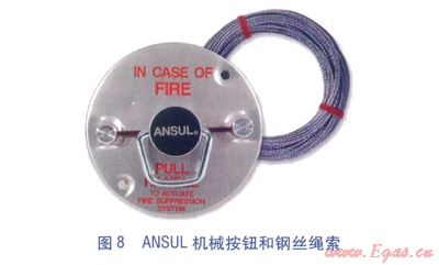 機(jī)械按鈕(見圖8)。是手動(dòng)啟動(dòng)滅火系統(tǒng)的操作工具,通過鋼絲繩索管連接到釋放裝置。機(jī)械按鈕拉環(huán)設(shè)計(jì)成允許三個(gè)手指操作,并有紅色字樣標(biāo)志,方便快速辨認(rèn)。