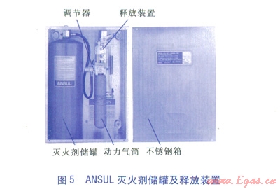 調(diào)節(jié)型釋放裝置。屬于一種裝有彈簧的機(jī)械、氣動(dòng)釋放裝置,配置一個(gè)儲(chǔ)存二氧化碳或氮?dú)獾膭?dòng)力氣筒,向滅火劑儲(chǔ)罐提供動(dòng)力氣供應(yīng),氣筒上安裝有調(diào)節(jié)器,氣筒的密封層設(shè)計(jì)成由釋放裝置擊穿。釋放裝置由熔線探測系統(tǒng)進(jìn)行自動(dòng)啟動(dòng),釋放裝置還可以通過鋼絲繩索連接設(shè)置在保護(hù)區(qū)以外的機(jī)械按鈕進(jìn)行遙控手動(dòng)開啟,另外可與大廈中央監(jiān)控系統(tǒng)的連接線兼容,將有關(guān)信號(hào)自動(dòng)傳輸?shù)酱髲B中央監(jiān)控系統(tǒng)。ANSUL滅火劑儲(chǔ)罐及釋放裝置見圖5