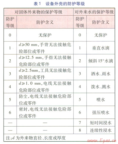 國際防護(hù)符號(hào)IP,即Ingress Protection Rating(防護(hù)等級(jí)),或International Protection Rating(國際保護(hù)等級(jí)),表示裝置外殼的防護(hù)等級(jí),由IP和后續(xù)的兩位數(shù)字組成。第一個(gè)數(shù)字為06,表示對(duì)固體外來物的保護(hù)等級(jí),第二個(gè)數(shù)字為08,表示對(duì)外來水的保護(hù)等級(jí),數(shù)字越大表示防護(hù)等級(jí)越高。國際電工技術(shù)委員會(huì)(International Eleetroteehnical Commission,IEC)標(biāo)準(zhǔn)IEC 529《外殼所提供的保護(hù)等級(jí)》(Degrees of Protection Provided by Enclosure)的相關(guān)規(guī)定見表1。