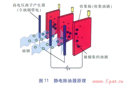 靜電除油器(見圖11),其原理是油煙進(jìn)入高壓電場,使油煙粒子帶電,在電場力作用下凝聚成油滴,沉積在收集板上,經(jīng)重力自流從而得到凈化。凈化過程的分離力直接作用于油煙粒子上,而不是作用于整個(gè)氣流上。因此,靜電除油器具有凈化效率高、壓降小的特點(diǎn)。收集板是其中一個(gè)非常重要的部件,須定期清理以確保靜電除油器的性能。