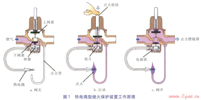 熱電偶熄火保護(hù)裝置的工作過程如圖l所示。當(dāng)燃具不工作時(shí),下閥塞關(guān)閉主燃?xì)馔?span lang="EN-US">(如圖1a)。當(dāng)按下點(diǎn)火按鈕時(shí),下閥塞打開,上閥塞關(guān)閉,燃?xì)馔ㄟ^點(diǎn)火管,燃具點(diǎn)火,同時(shí)鐵片與電磁鐵貼緊,點(diǎn)火火焰將熱電偶加熱,產(chǎn)生電動(dòng)勢,使電磁鐵得磁而吸住鐵片(如圖lb)。此時(shí)放開按鈕,上下閥塞均打開,主燃?xì)馔方油?,燃具正常工?span lang="EN-US">(如圖1c)。當(dāng)火焰意外熄滅時(shí),熱電偶冷卻,電動(dòng)勢消失,電磁鐵失磁,鐵片脫落,下閥塞在彈簧作用下關(guān)閉氣路(如圖la)。