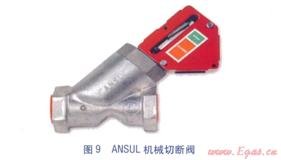 機(jī)械切斷閥(見圖9)。安裝于廚房燃?xì)饪傞y下游燃?xì)夤艿郎?,?dāng)ANSUL系統(tǒng)啟動(dòng)時(shí),機(jī)械切斷閥由鋼絲繩索控制而關(guān)閉,切斷廚房燃?xì)夤?yīng),經(jīng)手動(dòng)復(fù)位。