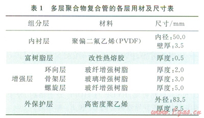 多層聚合物復合管道結構如圖1所示,其中由內(nèi)至外分別為內(nèi)襯層、富樹脂層、增強層和外保護層,每層具體所用的材質(zhì)及尺寸如表l所示,內(nèi)襯材料由比利時Sovlay公司提供。