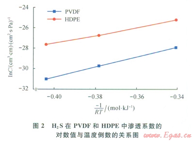 1) H2S在PVDF和HDPE中滲透系數(shù)的對數(shù)值與溫度倒數(shù)呈良好的線性關系,滲透規(guī)律符合Arrhenius模型關系: