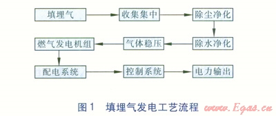 填埋場填埋氣發(fā)電原理是將固體廢棄物填埋場產生的填埋氣通過收集系統(tǒng)集中,再通過預處理裝置凈化(除塵、除水等)、穩(wěn)壓后送入燃氣發(fā)電機組,發(fā)電后通過配電系統(tǒng)、控制系統(tǒng),將發(fā)出的電能輸送到電網(填埋氣發(fā)電工藝流程見圖1)。