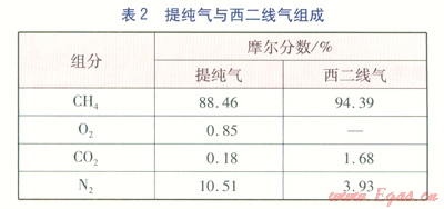 提純氣的調制要求是在滿足l2T天然氣的情況下與西二線氣滿足燃氣互換性的要求。經計算,當提純氣與西二線氣以體積比為1:1.5摻混時,調制氣高華白數(shù)為47.1MJ/m3,燃燒勢為37.36,滿足12T天然氣標準。