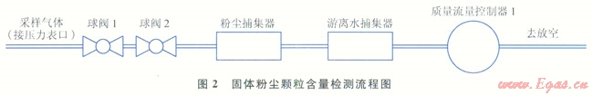 2)測(cè)試流程設(shè)計(jì)。采用濾筒捕集稱重方法獲得固體粉塵平均濃度,采用在線檢測(cè)方法得到氣質(zhì)粉塵動(dòng)態(tài)變化和粒徑分布,采用在線水露點(diǎn)儀和分子篩吸附等方法計(jì)算出水蒸氣含量和游離水含量,分析得知粉塵成分的基本組成,計(jì)算出固體粉塵顆粒物的平均分子量和密度,便于數(shù)據(jù)處理。同時(shí),檢測(cè)工作也存在一定的局限性:難以得到較高濃度固體粉塵含量的精確值,不能通過(guò)在線捕集方法在一個(gè)測(cè)試周期內(nèi)得到固體粉塵顆粒成分所需的樣品量等。