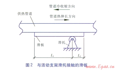 與活動(dòng)支架滑托接觸的滑板見圖2。滑托是靜止的,滑板與管道焊接在一起,滑板隨管道的熱脹冷縮一起運(yùn)動(dòng)。對(duì)于旋轉(zhuǎn)補(bǔ)償器設(shè)置在靠近一側(cè)固定支架的管段(見圖3),每個(gè)活動(dòng)支架處管道的熱伸長量、冷收縮量均不一致,越接近旋轉(zhuǎn)補(bǔ)償器的管道兩種位移量越大,這使得每個(gè)活動(dòng)支架處的滑板設(shè)計(jì)長度均不同。由于滑板越短,造價(jià)越低,熱損失越小,因此在滿足管道位移量的前提下(即不使得滑板脫離滑托),滑板越短越好。
