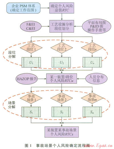 在獲得各工藝段位的個人風(fēng)險準(zhǔn)則RTCU之后,進入圖1所示的第2階段的場景分解:根據(jù)HAZOP報告(或其他的工藝災(zāi)害分析PHA結(jié)果),以及設(shè)施的人員分布信息,由下式計算各事故單元的個人風(fēng)險準(zhǔn)則RTCS。即