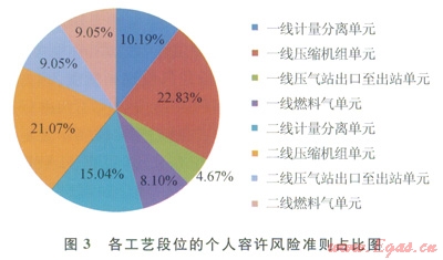 根據(jù)表1的數(shù)據(jù),由式(2)計算相對危險系數(shù)RH∽并按照圖1的流程進行第一層的風(fēng)險準(zhǔn)則額度分解,得到各工藝段位的RTCU值,如表2所示。各段位的風(fēng)險額度比例如圖3所示。從中可見,一線和二線的壓縮機組單元的RTCU值占比最大,兩者合計接近44%。表明壓縮機單元的風(fēng)險較大,因此所分配的個人風(fēng)險容許準(zhǔn)則也相對較大。這與從風(fēng)險經(jīng)濟學(xué)的角度看也是合理的,有利于從全局的角度優(yōu)化風(fēng)險處置的成本。