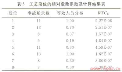 得到各工藝段位的風(fēng)險準(zhǔn)則額度后,按照圖1所示的第二階段計算流程,就可以得到某一工藝段位的各事故場景RTCS。為此需要統(tǒng)計該站場內(nèi)的人員分布情況,具體包括站長、自控工程師、設(shè)備工程師、通訊工程師、電氣工程師、運行人員、保管和門衛(wèi)等8類人員。這里各類人員都是當(dāng)作假想人員來加權(quán)考慮的,以避免某一類別的人員數(shù)增加而導(dǎo)致風(fēng)險評估中的Salami切片現(xiàn)象[3]??尚诺氖鹿蕡鼍皵?shù)根據(jù)該站場的HAZOP分析報告確定,此外本例中為簡化起見,令參數(shù)UFU=1。根據(jù)式(4)和式(5)計算得到最終所需要的事故場景定量風(fēng)險容許準(zhǔn)則值RTCU,如表3所示。