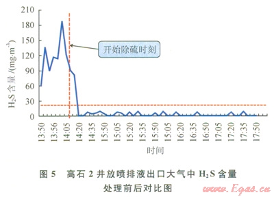 含硫井排出液自動(dòng)實(shí)時(shí)處理流程(圖4)和]二藝技術(shù)目前已經(jīng)在川渝地區(qū)多口井開展應(yīng)用,效果顯著(圖5),如高石2井在排液期間,采用該技術(shù)對(duì)井筒產(chǎn)出液進(jìn)行處理前,放噴出口大氣環(huán)境中H2S含量主要維持在115~173mg/m3范圍內(nèi),而應(yīng)用該技術(shù)后,放噴出口大氣環(huán)境中H2S含量降低到8.65mg/m3以內(nèi),可以滿足井場(chǎng)人員連續(xù)作業(yè)的要求。