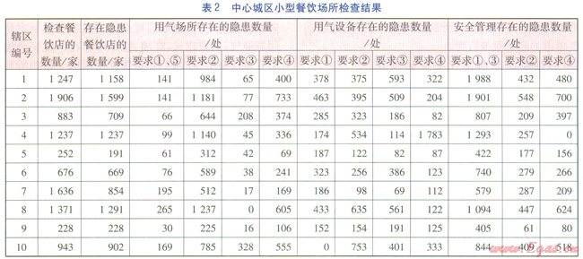 按照《武漢市燃?xì)夤芾項(xiàng)l例》規(guī)定,武漢市的市、區(qū)城管部門(mén)為燃?xì)庑姓鞴懿块T(mén),市、區(qū)城管部員兼有燃?xì)鈭?zhí)法職能?;诒?span lang="EN-US">1內(nèi)容,對(duì)各城區(qū)城管隊(duì)員進(jìn)行培訓(xùn),組織城管隊(duì)員進(jìn)行用氣安全檢查。檢查時(shí)間從2013年1月開(kāi)始,春節(jié)前結(jié)束。中心城門(mén)下設(shè)燃?xì)夤芾磙k公室,實(shí)行分級(jí)管理,所有城管隊(duì)員兼有燃?xì)鈭?zhí)法職能。基于表1內(nèi)容,對(duì)各城區(qū)城管隊(duì)員進(jìn)行培訓(xùn),組織城管隊(duì)員進(jìn)行用氣安全檢查。檢查時(shí)間從2013年1月開(kāi)始,春節(jié)前結(jié)束。中心放大器上型餐飲場(chǎng)所檢查結(jié)果見(jiàn)表2。