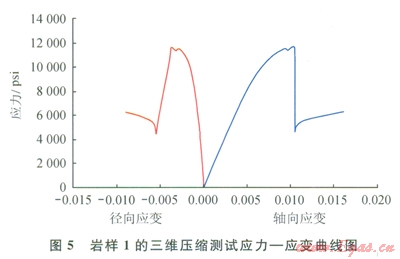 三維壓縮實(shí)驗(yàn)應(yīng)力 應(yīng)變曲線如圖5、6所示。巖石材料的塑性與脆性可根據(jù)應(yīng)力、應(yīng)變曲線上負(fù)坡的坡降大小來(lái)劃分。負(fù)坡較陡者為脆性,反之為塑性。由圖5、6可知:巖樣1和巖樣2在應(yīng)力分別為l2000psi(1psi=6.895kPa)和20000psi時(shí),應(yīng)變?yōu)?span lang="EN-US">0.01、0.009時(shí)破碎,屬于脆性巖石,且?guī)r樣2應(yīng)力、應(yīng)變曲線上的負(fù)坡較陡,故其脆性?xún)?yōu)于巖樣1。