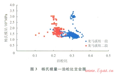 整體龍馬溪組楊氏模量介于l×104~3.5×104MPa,平均為2.3×104MPa;泊松比介于0.1~0.37,平均為0.24。通過(guò)圖3可以看出,龍馬溪組一段楊氏模量平均值為1.4×104MPa,泊松比平均值為0.3;龍馬溪組二段楊氏模量平均值為l.8×104MPa,泊松比平均值為0.23。龍馬溪組二段較龍馬溪組一段具有低泊松比,高楊氏模量,說(shuō)明其脆性?xún)?yōu)于一段。圖4為橫縱波時(shí)差比和泊松比的交會(huì)圖,可以看出龍馬溪組二段的橫縱波時(shí)差比明顯低于一段,說(shuō)明低橫縱波時(shí)差比參數(shù)用于表征頁(yè)巖的脆性程度是有效的。
