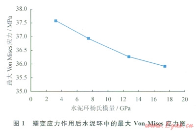 在以往關(guān)于蠕變地應(yīng)力對封固系統(tǒng)受力狀態(tài)影響的研究中,建立的封固系統(tǒng)模型通常包括套管、水泥環(huán)和地層3個部分,將蠕變地應(yīng)力施加于地層外側(cè)[19-20]。工程實(shí)際中,蠕變地應(yīng)力最終直接作用于水泥環(huán)上[15],與上述建立的模型有所差別。本研究根據(jù)工程實(shí)際情況,建立的封固系統(tǒng)模型只包括套管和水泥環(huán)兩部分,將蠕變地應(yīng)力直接施加于水泥環(huán)外側(cè)。井眼直徑取為215.9mm,套管內(nèi)外徑分別取為l57.1mm和177.8mm,套管楊氏模量及泊松比分別取為210GPa和0.26,水泥環(huán)泊松比取為0.19,變化水泥環(huán)楊氏模量分別為3.32GPa(水泥漿密囊1.57g/cm3,無圍壓,抗壓強(qiáng)度16.4MPa)、7.49GPa(水泥漿密度1.79g/cm3,無圍壓,抗壓強(qiáng)度21.2MPa)、l2.73GPa(水泥漿密度1.85g/cm3,圍壓5MPa,抗壓強(qiáng)度27.1MPa)、17.45GPa(水泥漿密度1.9g/cm3,圍壓20MPa,抗壓強(qiáng)度34.3MPa)。一界面和二界面處的初始擠壓應(yīng)力分別設(shè)為2MPa和3MPa,蠕變地應(yīng)力取為40MPa。利用ANSYS軟件建模和計算封同系統(tǒng)中的應(yīng)力,選擇Von Mises準(zhǔn)則汁算得到水泥環(huán)中的最大應(yīng)力(位于水泥環(huán)內(nèi)側(cè))(圖1)。