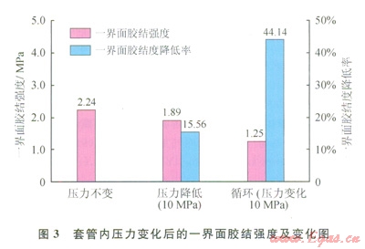 按照本文參考文獻(xiàn)[20]的方法制作固井封固系統(tǒng)模型,測試套管內(nèi)壓力變化對界面剪切膠結(jié)強(qiáng)度的影響。模型l制作完成后,模擬套管內(nèi)壓力不變的情況;模型2制作完成后,模擬套管內(nèi)壓力降低10MPa的情況;模型3制作完成后,模擬套管內(nèi)壓力循環(huán)變化的情況,變化幅度為l0MPa。測量并計算上述封固系統(tǒng)模型的一界面膠結(jié)強(qiáng)度,并分別以套管內(nèi)壓力不變時的一組模型的界面膠結(jié)強(qiáng)度為標(biāo)準(zhǔn),計算分析套管內(nèi)壓力變化時的一界面膠結(jié)強(qiáng)度變化(圖3)。
