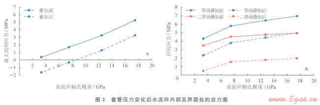 由圖4-a圖看出,水泥環(huán)內(nèi)的最大Von Miscs應(yīng)力隨水泥環(huán)楊氏模量的增大而增大;與初始應(yīng)力替加后,Von Mises應(yīng)力增大為4.4~8.0MPa,小于普通水泥環(huán)的屈服強(qiáng)度。所以,當(dāng)溫度變化幅度不大時,水泥環(huán)通常不會發(fā)生屈服破壞,但溫度升高幅度較大時水泥環(huán)可能會發(fā)生屈服破壞。因此,對熱采井等應(yīng)避免使用膨脹水泥漿,且應(yīng)使用低楊氏模量的水泥環(huán)。由圖4-b可以看出,與初始應(yīng)力疊加前,一、二界面在徑向上受拉伸應(yīng)力的作用且應(yīng)力隨水泥環(huán)的楊氏模量增大而增大,為4.4~8.0MPa,遠(yuǎn)大于一、二界面膠結(jié)的抗拉強(qiáng)度,會破壞一、二界面膠結(jié);與初始應(yīng)力疊加后,徑向應(yīng)力顯著降低至1.4~6.0MPa,降低了一、二界面膠結(jié)破壞的風(fēng)險。因此,通過降低水泥環(huán)楊氏模量和增大初始應(yīng)力都可以降低界面膠結(jié)破壞的風(fēng)險,建議采用較低楊氏模量的水泥環(huán)或使用膨脹水泥來預(yù)防失效。