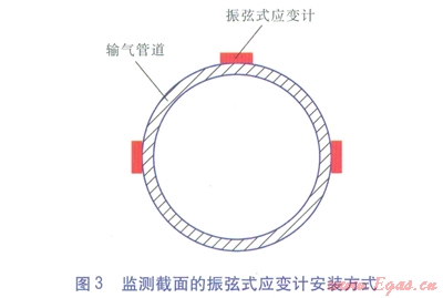目前國內(nèi)外比較先進的管道應變傳感器主要包括振弦式應變計、FBG光纖光柵應變計、GFRP分布式應變傳感光纜。VK-4150型振弦式應變計見圖2。監(jiān)測截面的振弦式應變計安裝方式見圖3。監(jiān)測截面指輸氣管道上安裝了振弦式應變計的一個受測截面,每個監(jiān)測截面安裝3支振弦式應變計,呈品字形安裝的3支振弦式應變計足以計算出管道在該截面圓周上任意一點的應變量。沿管道軸向間隔20m左右設1個監(jiān)測截面,一個監(jiān)測截面的造價約1.5×104元。
