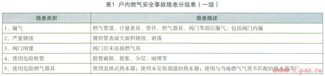 以筆者所在單位為例,目前將戶內(nèi)燃?xì)獍踩[患分為三級,一級隱患風(fēng)險(xiǎn)等級最高,共5類,如表l所示。