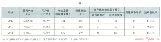 現(xiàn)取近3年6家燃?xì)夤竟芫W(wǎng)及違章數(shù)據(jù)統(tǒng)計,見表1。