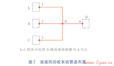 某溶液熱回收系統(tǒng)管道布置見圖2,溶液分別從熱質回收塔A、B、C吸收熱量后在節(jié)點0匯合,進入稀溶液儲液罐D。