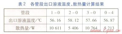 由單管溫降模型、單管散熱模型計算得到的各管段出口溶液溫度、散熱量見表2。由管網仿真模型計算得到節(jié)點0處溶液溫度為57.38℃,溶液質量分數(shù)為40.18%。