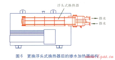 將原加熱盤管拆除(見圖4),更換成浮頭式換熱器(見圖5)。改造完畢后,按要求試壓。1臺(tái)摻水加熱爐安裝1臺(tái)浮頭式換熱器,另制造1臺(tái)浮頭式換熱器作為3臺(tái)摻水加熱爐的備用換熱器。當(dāng)某臺(tái)浮頭式換熱器結(jié)垢嚴(yán)重,需要清垢時(shí),先停爐拆下該浮頭式換熱器,更換上備用換熱器,然后摻水加熱爐繼續(xù)運(yùn)行,從而減輕對(duì)正常運(yùn)行的影響。更換浮頭式換熱器后的摻水加熱器結(jié)構(gòu)見圖6。