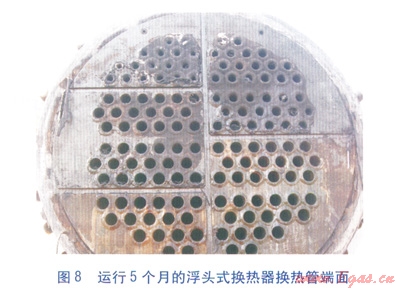 3臺(tái)摻水加熱爐于2012年10月陸續(xù)改造完成,并同期投產(chǎn)運(yùn)行。改造后的3臺(tái)加熱爐運(yùn)行情況基本平穩(wěn),直至2013年3月才陸續(xù)出現(xiàn)換熱效率低的現(xiàn)象。原加熱盤管基本兩個(gè)月就需要酸洗一次,酸液對(duì)金屬的腐蝕性強(qiáng),易揮發(fā)產(chǎn)生酸霧污染原油,降低管道及設(shè)備的使用壽命[1]。而且隨著運(yùn)行時(shí)間的延長,酸洗的次數(shù)增加,加熱盤管內(nèi)壁結(jié)垢傾向越來越嚴(yán)重,酸洗也變得無能為力。而改造后的浮頭換熱器能夠通過機(jī)械通洗繼續(xù)使用,清洗周期也比原加熱盤管有所延長。拆除后堵塞嚴(yán)重的加熱盤管見圖7,運(yùn)行5個(gè)月的浮頭式換熱器換熱管端面見圖8。實(shí)踐充分證明,采用浮頭式換熱器替代蛇形加熱盤管,內(nèi)壁涂覆防垢涂層并提高摻水流速,有效地延緩了清洗時(shí)間。浮頭式換熱器可抽出,方便清洗,確保了原油正常生產(chǎn)。