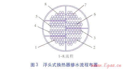 浮頭式換熱器摻水流程布置見圖3。流程1為進(jìn)水,流程8為出水。摻水由流程1進(jìn)入換熱器后,依次流經(jīng)流程2、3、4、5、6、7,最后由流程8流出。