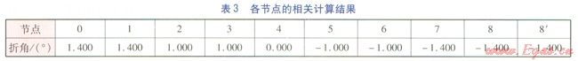 某直埋供熱管道規(guī)格為DN 1000mm,在敷設過程中遇到障礙物,要求在40m左右的距離內偏移1m,之后管道需再調整回原管位。最大允許折角取1.4°,管段最短長度限定為1m。管道布置方式見圖4。由于管道基本以障礙物(管段8—8¢所在位置)為中心成對稱布置,因此圖4僅給出一側的管道。各節(jié)點、各管段的相關計算結果分別見表3、4。為方便表述,定義管段向右側偏轉時,折角為正值;向左側偏轉時,折角為負值。