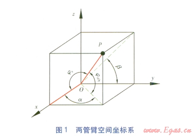利用CAD軟件求解空間折角的優(yōu)勢是直觀、準確,但是需要較多步驟和計算機操作技巧。更重要的是,在許多情況下(如在施工現場等),無法提供給我們適合的計算機操作環(huán)境,只能通過手工計算求解。設定兩根管臂中的一根管臂所在直線為x軸,這樣我們只需計算出另一根管臂與x軸的夾角。兩管臂空坐標系見圖1,一根管臂為x軸,另一個管臂(x軸管臂)xOy(水平面)上的投影與x軸夾角為a,與xOy面夾角為jxOy,兩管臂空間折角為jx。